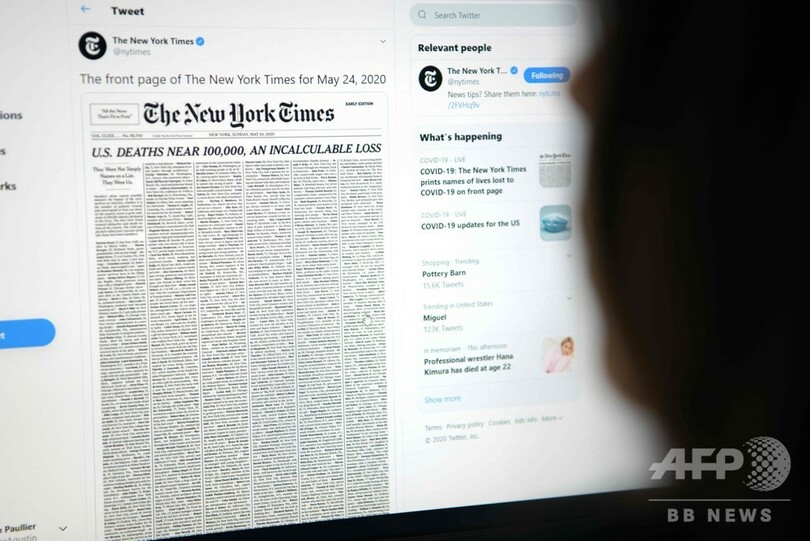 【5月24日 AFP】米国における新型コロナウイルスの死者が10万人に迫る中、米ニューヨーク・タイムズ(New York Times)は24日付の1面に死者1000人の死亡記事を掲載し、痛ましい節目に哀悼の意を表した。