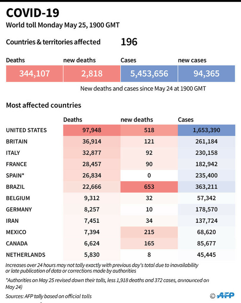 【5月26日 AFP】AFPが各国当局の発表に基づき日本時間26日午前4時にまとめた統計によると、世界の新型コロナウイルスによる死者数は34万4107人に増加した。