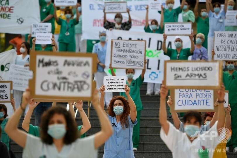 【5月26日 AFP】新型コロナウイルスと最前線で闘うスペインの医療従事者らが25日、首都マドリードとその周辺地域の複数の病院前に集まり、防護用品の不足に抗議した。