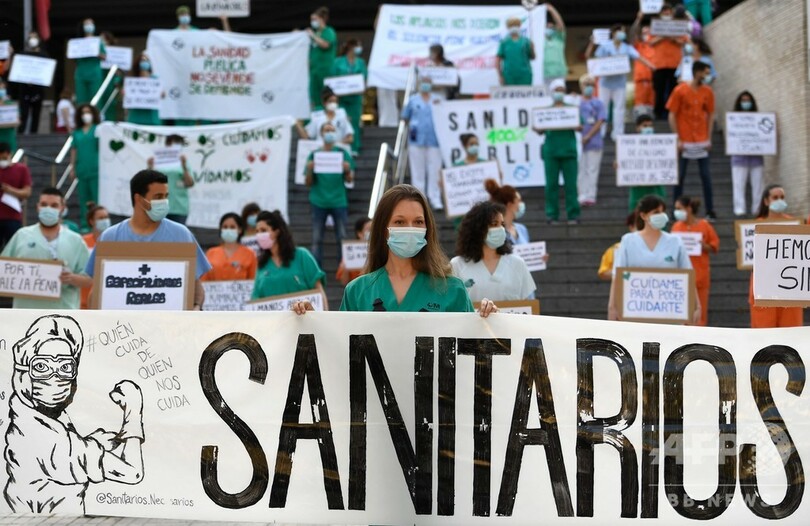 【5月26日 AFP】新型コロナウイルスと最前線で闘うスペインの医療従事者らが25日、首都マドリードとその周辺地域の複数の病院前に集まり、防護用品の不足に抗議した。