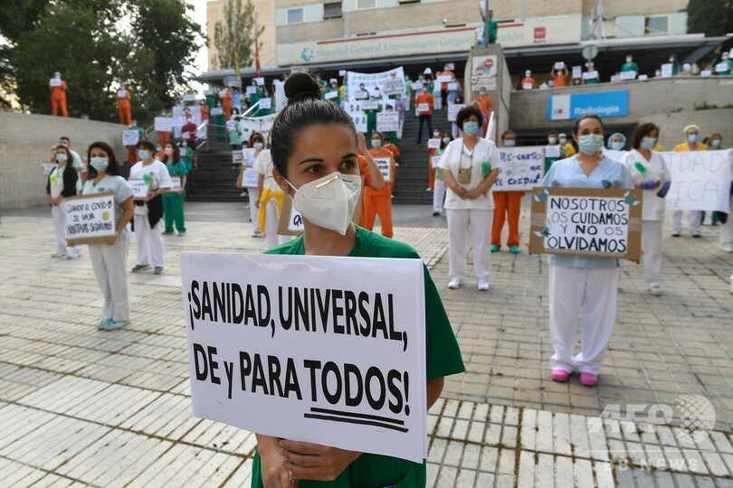 【5月26日 AFP】新型コロナウイルスと最前線で闘うスペインの医療従事者らが25日、首都マドリードとその周辺地域の複数の病院前に集まり、防護用品の不足に抗議した。