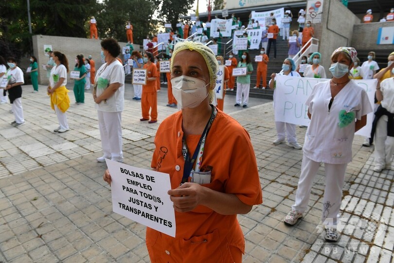 【5月26日 AFP】新型コロナウイルスと最前線で闘うスペインの医療従事者らが25日、首都マドリードとその周辺地域の複数の病院前に集まり、防護用品の不足に抗議した。