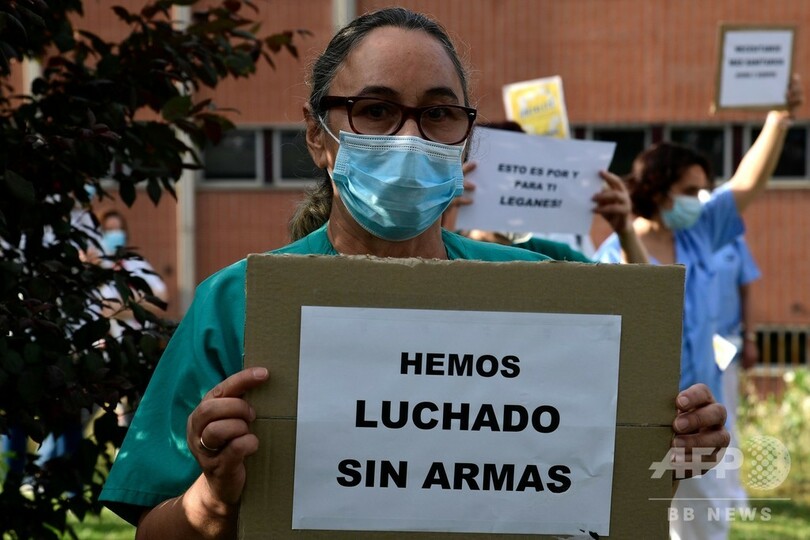 【5月26日 AFP】新型コロナウイルスと最前線で闘うスペインの医療従事者らが25日、首都マドリードとその周辺地域の複数の病院前に集まり、防護用品の不足に抗議した。