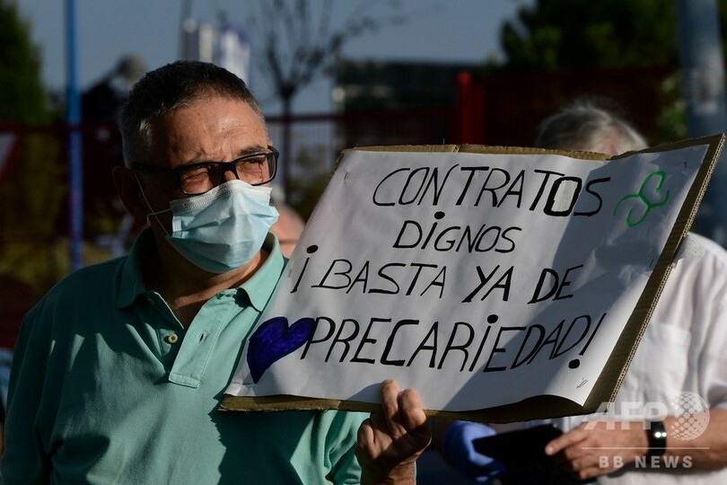 【5月26日 AFP】新型コロナウイルスと最前線で闘うスペインの医療従事者らが25日、首都マドリードとその周辺地域の複数の病院前に集まり、防護用品の不足に抗議した。