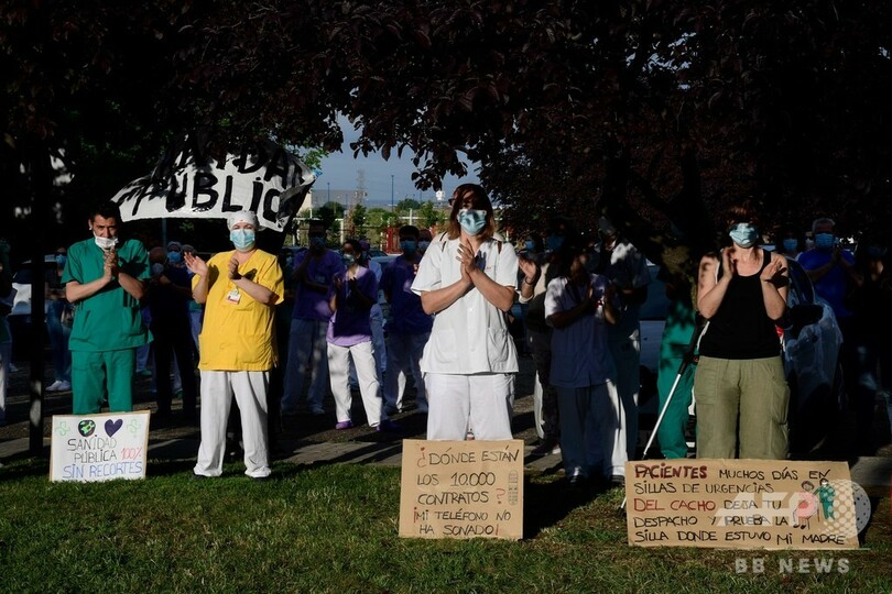 【5月26日 AFP】新型コロナウイルスと最前線で闘うスペインの医療従事者らが25日、首都マドリードとその周辺地域の複数の病院前に集まり、防護用品の不足に抗議した。
