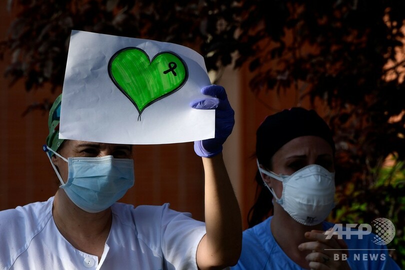 【5月26日 AFP】新型コロナウイルスと最前線で闘うスペインの医療従事者らが25日、首都マドリードとその周辺地域の複数の病院前に集まり、防護用品の不足に抗議した。