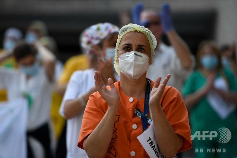 【5月26日 AFP】新型コロナウイルスと最前線で闘うスペインの医療従事者らが25日、首都マドリードとその周辺地域の複数の病院前に集まり、防護用品の不足に抗議した。