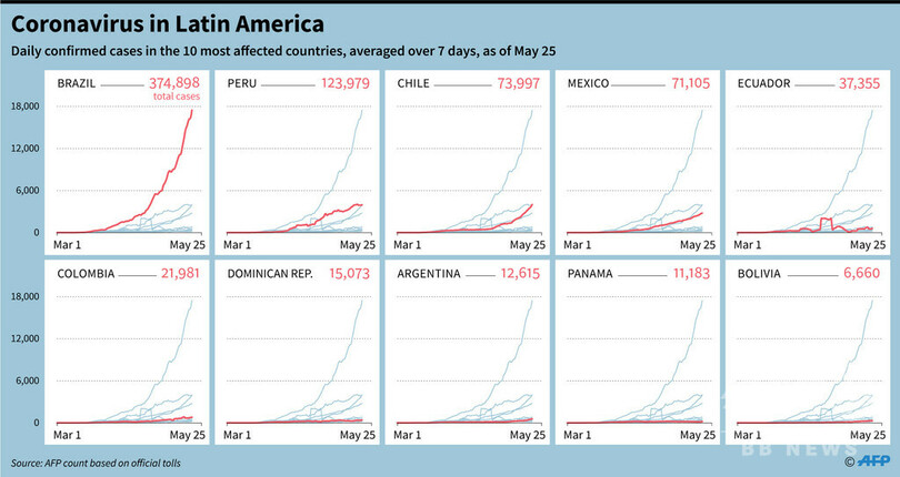 地域別の死者数は、欧州が17万3665人(感染205万7043人)、米国・カナダが10万5291人(感染175万8341人)、中南米・カリブ海(Caribbean Sea)諸国が4万1665人(感染77万4772人)、アジアが1万4500人(感染46万6830人)、中東が8961人(感染35万8699人)、アフリカが3511人(感染11万7423人)、オセアニアが130人(感染8491人)となっている。