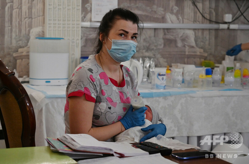 【6月6日 AFP】ウクライナの首都キエフのホテルで、プラスチック製のベビーベッドに赤ちゃんがずらりと並んでいる。マスクと手袋を着用したスタッフがミルクをあげたり、おむつを交換したりしている。