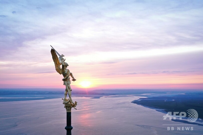 【6月3日 AFP】仏北西部ノルマンディー(Normandy)のモンサンミシェルの修道院(Mont Saint-Michel Abbey)で、夜明けの空に浮かび上がる尖塔(せんとう)の大天使ミカエルとドラゴン像をとらえた空撮写真。