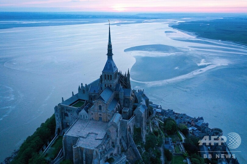 【6月3日 AFP】仏北西部ノルマンディー(Normandy)のモンサンミシェルの修道院(Mont Saint-Michel Abbey)で、夜明けの空に浮かび上がる尖塔(せんとう)の大天使ミカエルとドラゴン像をとらえた空撮写真。