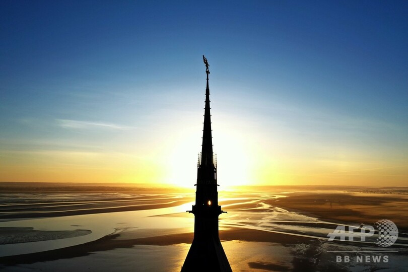 【6月3日 AFP】仏北西部ノルマンディー(Normandy)のモンサンミシェルの修道院(Mont Saint-Michel Abbey)で、夜明けの空に浮かび上がる尖塔(せんとう)の大天使ミカエルとドラゴン像をとらえた空撮写真。
