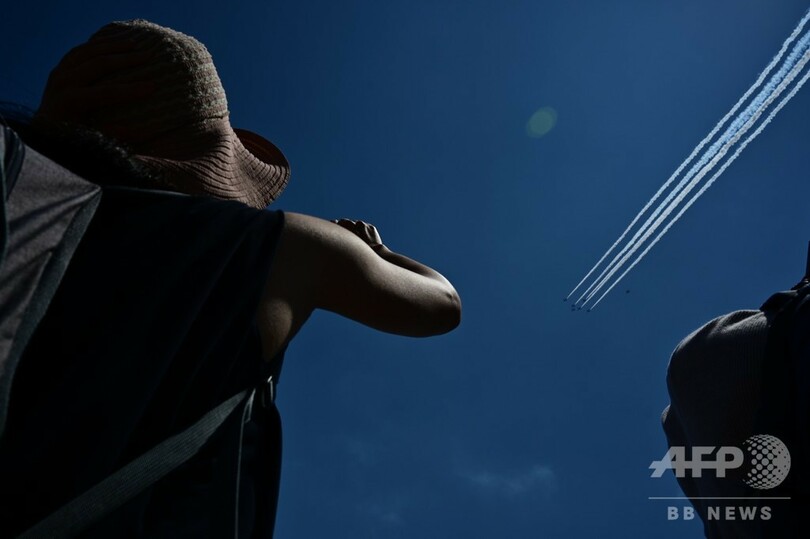 【5月29日 AFP】(写真追加)新型コロナウイルスと闘う医療従事者らに感謝の気持ちを示すため、航空自衛隊のアクロバット飛行チーム「ブルーインパルス(Blue Impulse)」が29日、東京都心の上空を飛行した。(c)AFP