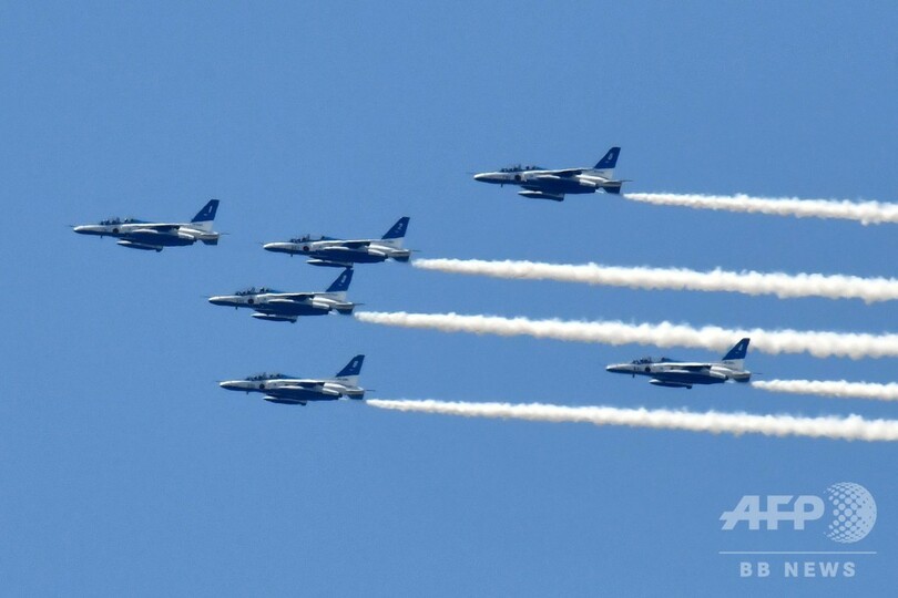 【5月29日 AFP】(写真追加)新型コロナウイルスと闘う医療従事者らに感謝の気持ちを示すため、航空自衛隊のアクロバット飛行チーム「ブルーインパルス(Blue Impulse)」が29日、東京都心の上空を飛行した。(c)AFP