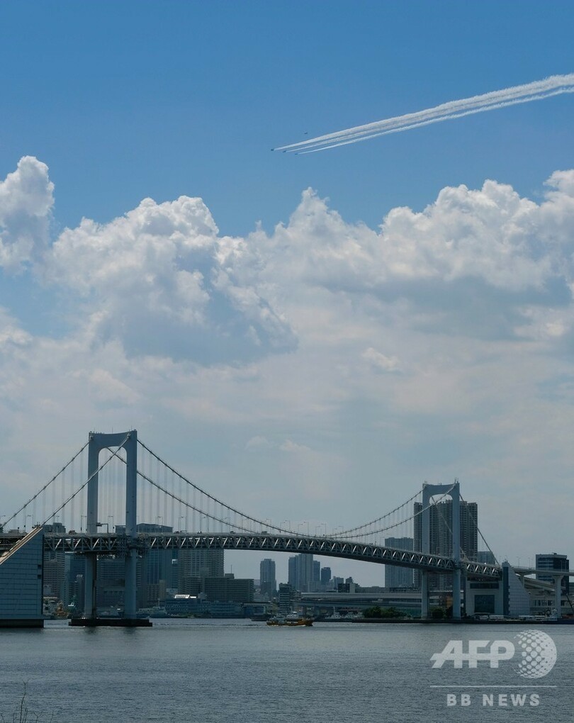 【5月29日 AFP】(写真追加)新型コロナウイルスと闘う医療従事者らに感謝の気持ちを示すため、航空自衛隊のアクロバット飛行チーム「ブルーインパルス(Blue Impulse)」が29日、東京都心の上空を飛行した。(c)AFP