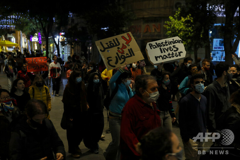 デモ参加者らは、ヘブライ語や英語で「警察の暴力が殺した」「イヤドに正義を」「パレスチナ人の命は大切」などと書かれたパネルを掲げた。新型コロナウイルスの感染予防のため、多くのデモ参加者はマスクを着用していた。(c)AFP