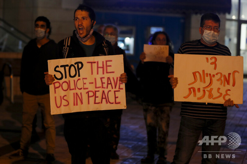 デモ参加者らは、ヘブライ語や英語で「警察の暴力が殺した」「イヤドに正義を」「パレスチナ人の命は大切」などと書かれたパネルを掲げた。新型コロナウイルスの感染予防のため、多くのデモ参加者はマスクを着用していた。(c)AFP