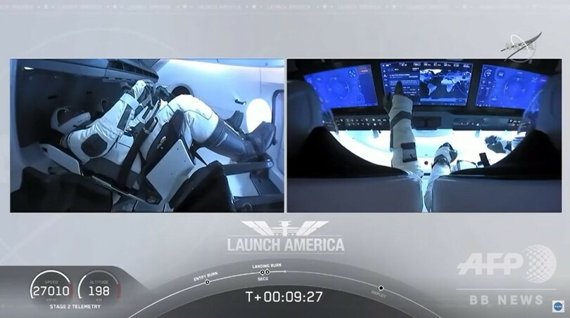 宇宙船に乗り込んでいるロバート・ベンケン(Robert Behnken)氏とダグラス・ハーリー(Douglas Hurley)氏は、スペースシャトル(Space Shuttle)の搭乗経験もあるベテランの宇宙飛行士。(c)AFP