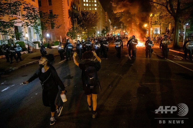 ホワイトハウス前には機動隊が列をつくり、近くの公園に結集したデモ隊と対峙(たいじ)していたが、現場のAFP記者によると、夜になって警察とデモ隊の間で小競り合いが発生。警察が催涙弾や催涙スプレー、閃光(せんこう)発音筒を用いてデモ隊を解散させようと試みている。デモ隊の中には付近で火をたいたり、建物に落書きをしたりしていた者たちがいた。