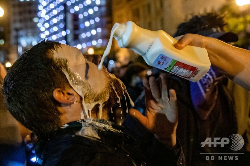 ホワイトハウス前には機動隊が列をつくり、近くの公園に結集したデモ隊と対峙(たいじ)していたが、現場のAFP記者によると、夜になって警察とデモ隊の間で小競り合いが発生。警察が催涙弾や催涙スプレー、閃光(せんこう)発音筒を用いてデモ隊を解散させようと試みている。デモ隊の中には付近で火をたいたり、建物に落書きをしたりしていた者たちがいた。