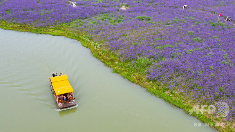 【6月2日 CNS】中国・江蘇省(Jiangsu)南京市(Nanjing)で5月31日、「侯衝(Houchong)」景勝区のクマツヅラ(馬鞭草)の花が一斉に咲き、一面が「紫色の花じゅうたん」となり、多くの市民と観光客を引き付けていた。 (c)CNS/JCM/AFPBB News