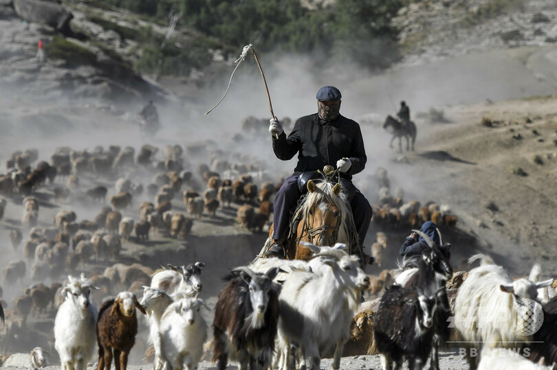 アルタイ地区では100万頭とも言われるウシやヒツジの大移動の季節に入り、遊牧民らウシやヒツジを追いながら、居住用のテントや生活用品をラクダの背に縛り付け、冬季の居住地帯から夏季の牧場へ移動してゆく。(c)CNS/JCM/AFPBB News