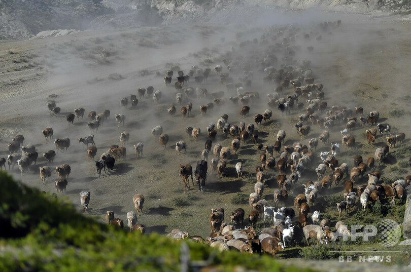 アルタイ地区では100万頭とも言われるウシやヒツジの大移動の季節に入り、遊牧民らウシやヒツジを追いながら、居住用のテントや生活用品をラクダの背に縛り付け、冬季の居住地帯から夏季の牧場へ移動してゆく。(c)CNS/JCM/AFPBB News
