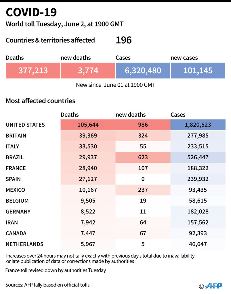 【6月3日 AFP】AFPが各国当局の発表に基づき日本時間3日午前4時にまとめた統計によると、世界の新型コロナウイルスによる死者数は37万7213人に増加した。