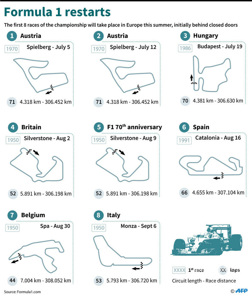 【6月3日 AFP】フォーミュラワン(F1、F1世界選手権)の主催者は2日、新型コロナウイルスの影響で開幕が延期になっていた今シーズンについて、7月上旬のオーストリアGP(Austrian Grand Prix 2020)で開始すると発表した。同国で7月5日と12日に無観客で決勝2レースを行った後、さらに6戦が欧州で開催される。