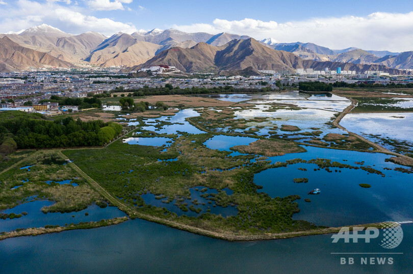 総面積12平方キロメートルを超える自然保護区は、世界で海抜の最も高い都市近郊の湿地だ。広大な湿地はラサ市街地の大気中のちりを吸収し、都市汚水を浄化する役割を果たしていることから「ラサの肺」と呼ばれる。湿地には野鳥や昆虫が生息し、生物の楽園として生き生きとした四季折々の光景が楽しめる。湿地からポタラ宮を遠くから眺めることもできる。(c)CNS/JCM/AFPBB News