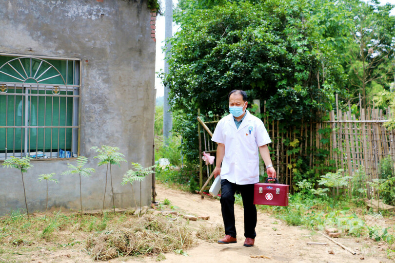 【6月8日 CNS】中国・安徽省(Anhui)肥西県(Feixi)白竜村(Bailong)の村医者、湯永(Tang Yong)さんは2日、当地の貧困家庭にやって来て血圧の測定と心音の確認などの日常的な健康検査を行っていた。