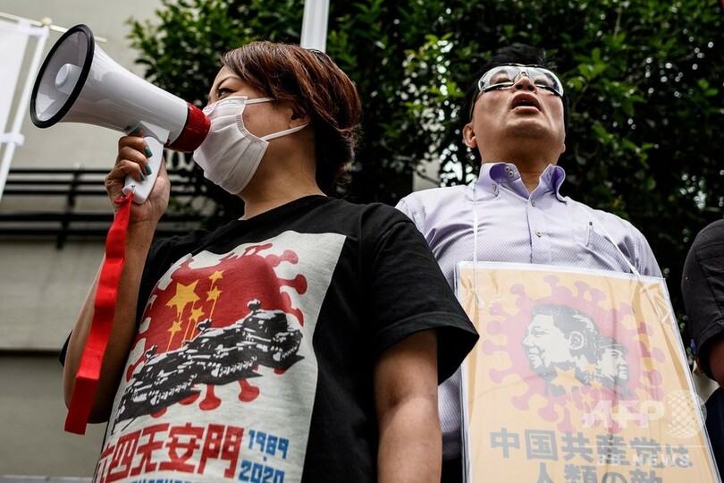 【6月4日 AFP】中国が民主化を求める学生らの運動を武力で鎮圧した天安門(Tiananmen)事件から31年を迎える4日、東京・港区の中国大使館前で民主派活動家らのグループが抗議デモを行った。