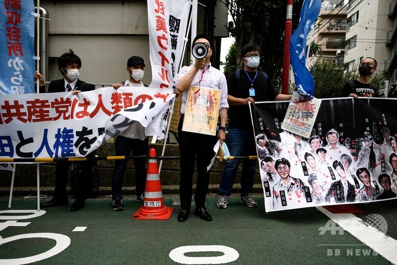 【6月4日 AFP】中国が民主化を求める学生らの運動を武力で鎮圧した天安門(Tiananmen)事件から31年を迎える4日、東京・港区の中国大使館前で民主派活動家らのグループが抗議デモを行った。