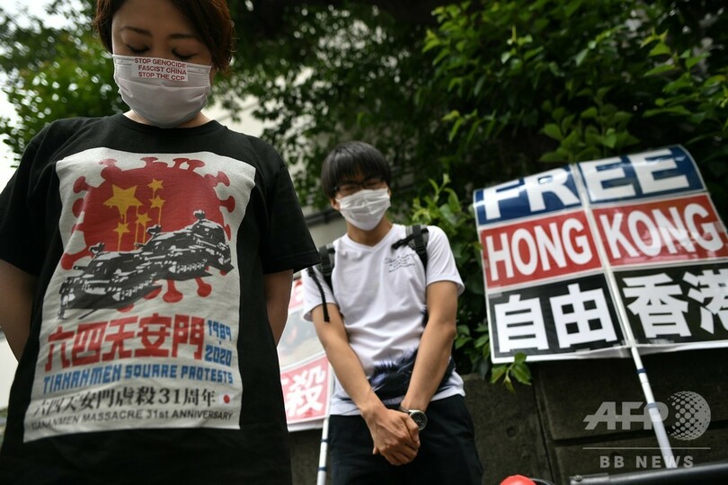 【6月4日 AFP】中国が民主化を求める学生らの運動を武力で鎮圧した天安門(Tiananmen)事件から31年を迎える4日、東京・港区の中国大使館前で民主派活動家らのグループが抗議デモを行った。
