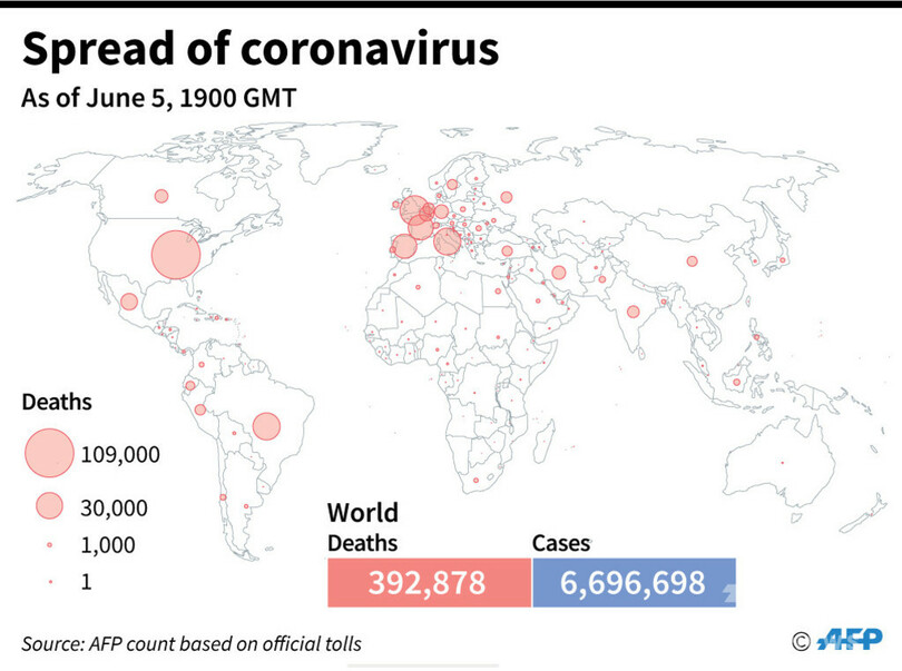 【6月6日 AFP】AFPが各国当局の発表に基づき日本時間6日午前4時にまとめた統計によると、世界の新型コロナウイルスによる死者数は39万2878人に増加した。