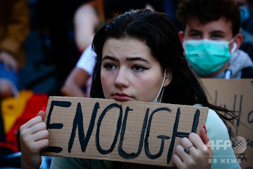 デモ参加者らは、米ミネソタ州ミネアポリス(Minneapolis)で警察に首を膝で押さえつけられて死亡したアフリカ系米国人ジョージ・フロイド(George Floyd)さんの最後の言葉に賛同し、「息ができない」と書かれたプラカードを掲げた。フロイドさんが警察の拘束下で死亡したことにより、人権侵害に反対する抗議デモが世界中で行われている。