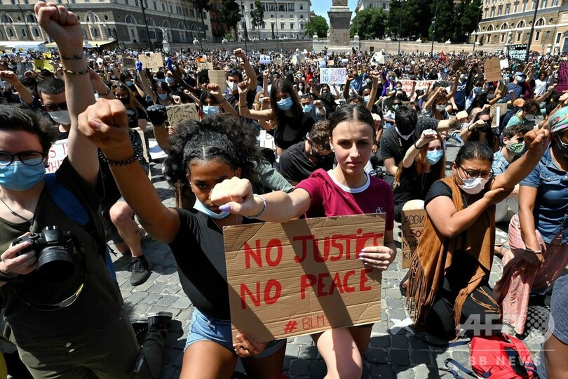イタリア・ローマのポポロ広場(Piazza del Popolo)では、フロイドさんが警官に押さえつけられていた時間とほぼ同じ8分間の黙とうがささげられる間、デモ参加者の多くが膝をつき、拳を上げた。