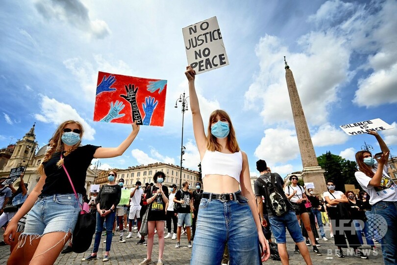 イタリア・ローマのポポロ広場(Piazza del Popolo)では、フロイドさんが警官に押さえつけられていた時間とほぼ同じ8分間の黙とうがささげられる間、デモ参加者の多くが膝をつき、拳を上げた。