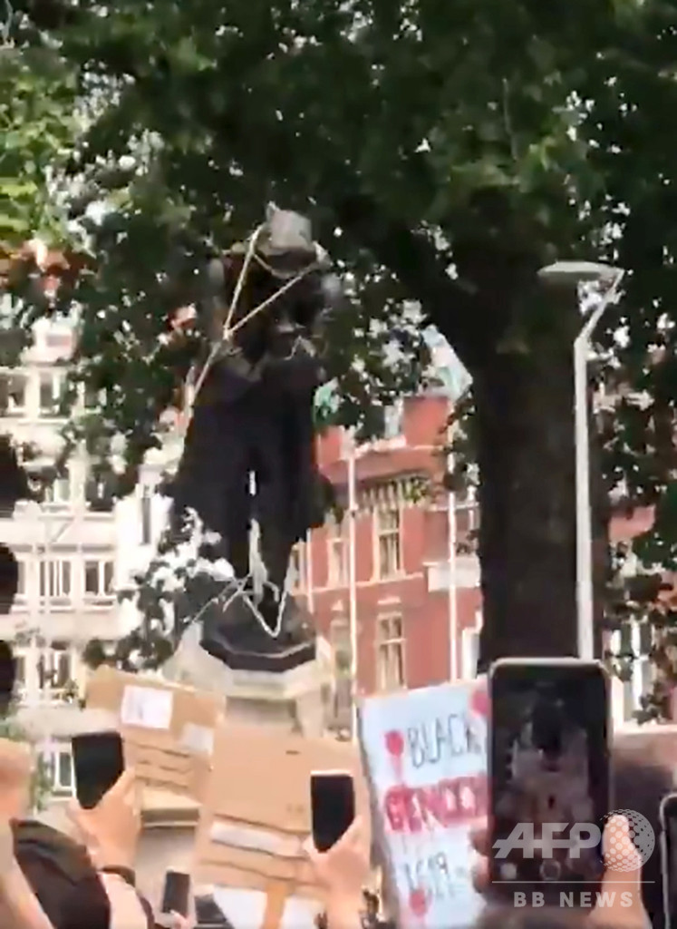 英ブリストル(Bristol)では7日、米黒人男性ジョージ・フロイド(George Floyd)さんの死に抗議するデモの参加者らが、奴隷の売買で財を成した有名なエドワード・コルストン(Edward Colston)の像を引き倒し、川に投げ込む出来事があった。