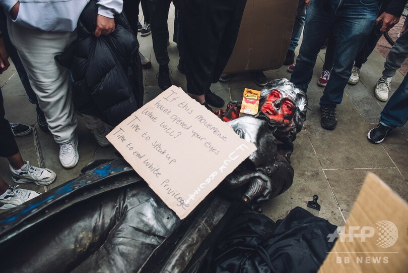 英ブリストル(Bristol)では7日、米黒人男性ジョージ・フロイド(George Floyd)さんの死に抗議するデモの参加者らが、奴隷の売買で財を成した有名なエドワード・コルストン(Edward Colston)の像を引き倒し、川に投げ込む出来事があった。