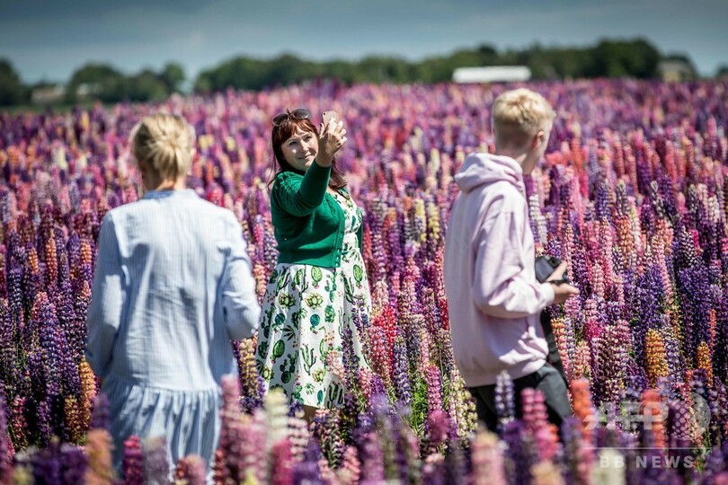 【6月17日 AFP】デンマーク・ロラン(Lolland)島の外れにあるルピナス畑で自撮りする女性。
