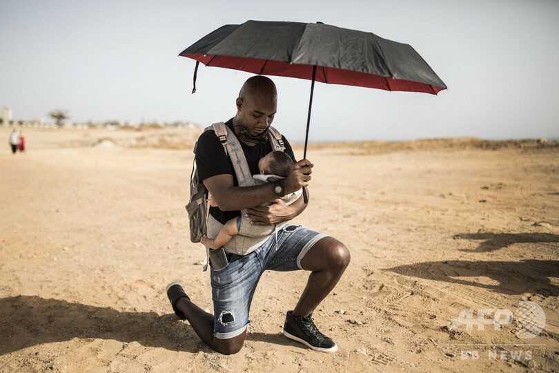 【6月16日 AFP】セネガル・ダカールで「Black Lives Matter(黒人の命は大切)」運動と連帯し、人種差別に抗議するためにひざまずく赤ちゃん連れの男性。