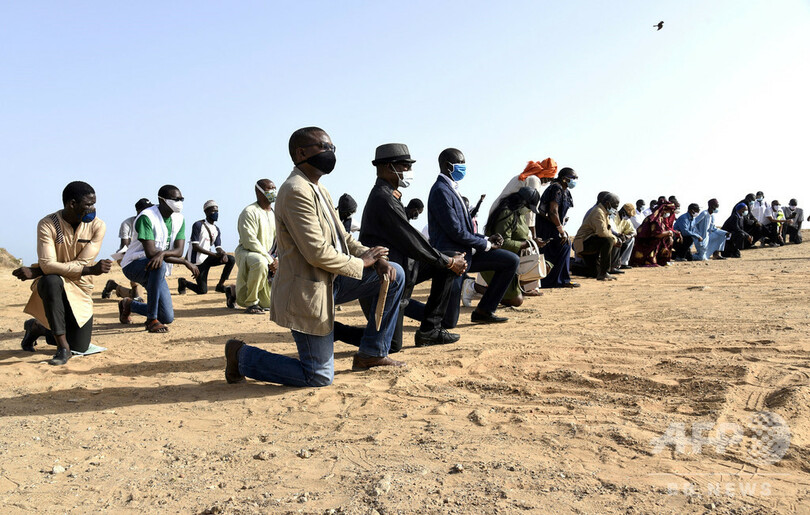 【6月16日 AFP】セネガル・ダカールで「Black Lives Matter(黒人の命は大切)」運動と連帯し、人種差別に抗議するためにひざまずく赤ちゃん連れの男性。