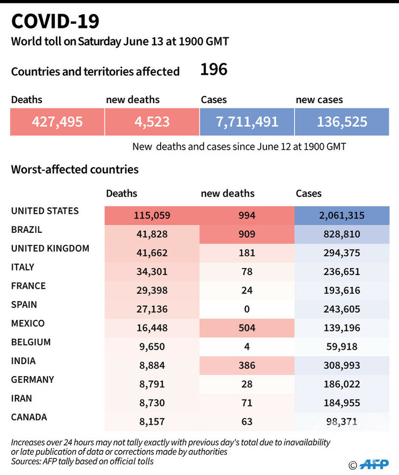 【6月14日 AFP】AFPが各国当局の発表に基づき日本時間14日午前4時にまとめた統計によると、世界の新型コロナウイルスによる死者数は42万7495人に増加した。