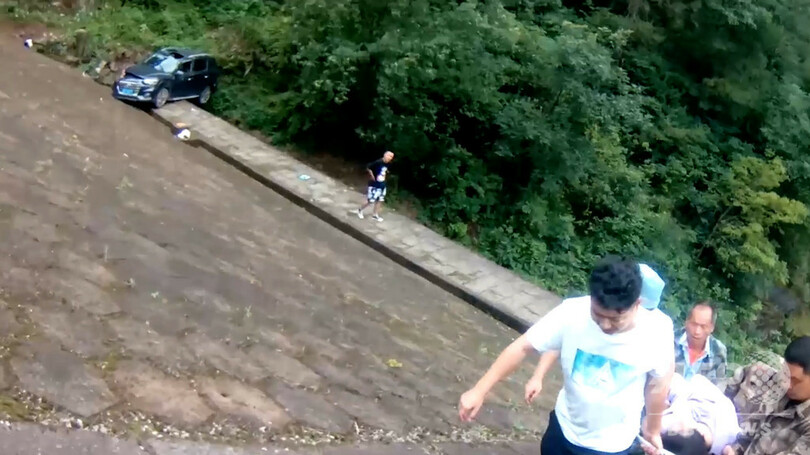 自動車がダムの堤防を100メートル滑落、車上の二人は安全ベルトで無事 中国・浙江省