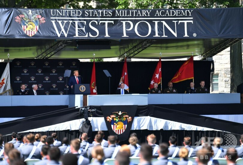 トランプ氏は、卒業する1107人の新任少尉を前に、「米国は人類史上、最も優れた国だ」と主張。卒業生らは明るい日差しの中、陸軍士官学校の練兵場で互いに十分な距離を保って腰掛けていた。