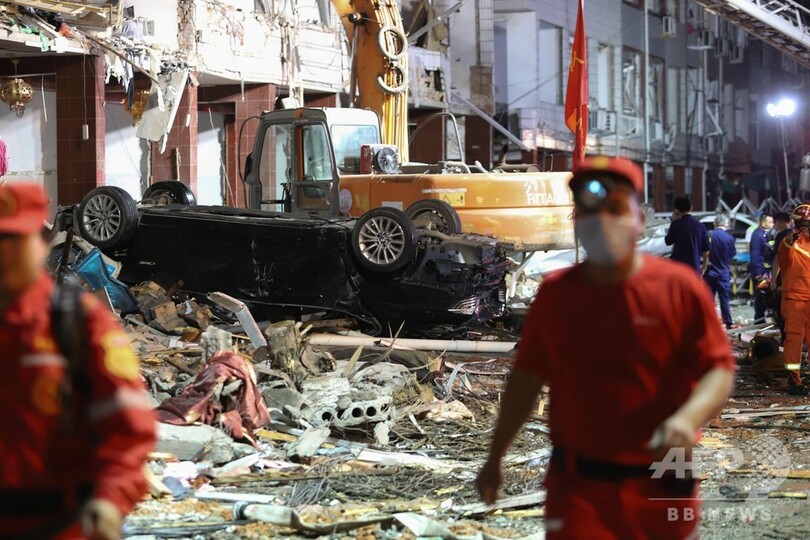 国営新華社(Xinhua)通信の同日の報道によると、タンクローリーは最初の爆発後、高速道路付近の工場に転落し、再び爆発した。救急隊員らは、引き続き捜索と救助活動に当たっているという。(c)AFP