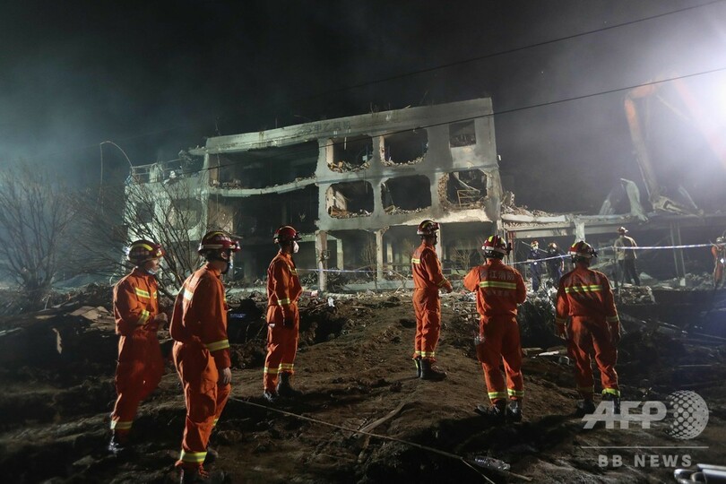 国営新華社(Xinhua)通信の同日の報道によると、タンクローリーは最初の爆発後、高速道路付近の工場に転落し、再び爆発した。救急隊員らは、引き続き捜索と救助活動に当たっているという。(c)AFP