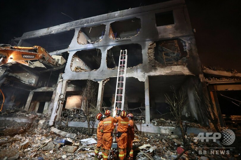 国営新華社(Xinhua)通信の同日の報道によると、タンクローリーは最初の爆発後、高速道路付近の工場に転落し、再び爆発した。救急隊員らは、引き続き捜索と救助活動に当たっているという。(c)AFP