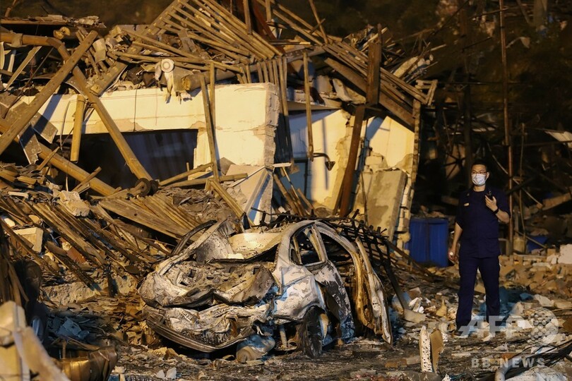 国営新華社(Xinhua)通信の同日の報道によると、タンクローリーは最初の爆発後、高速道路付近の工場に転落し、再び爆発した。救急隊員らは、引き続き捜索と救助活動に当たっているという。(c)AFP